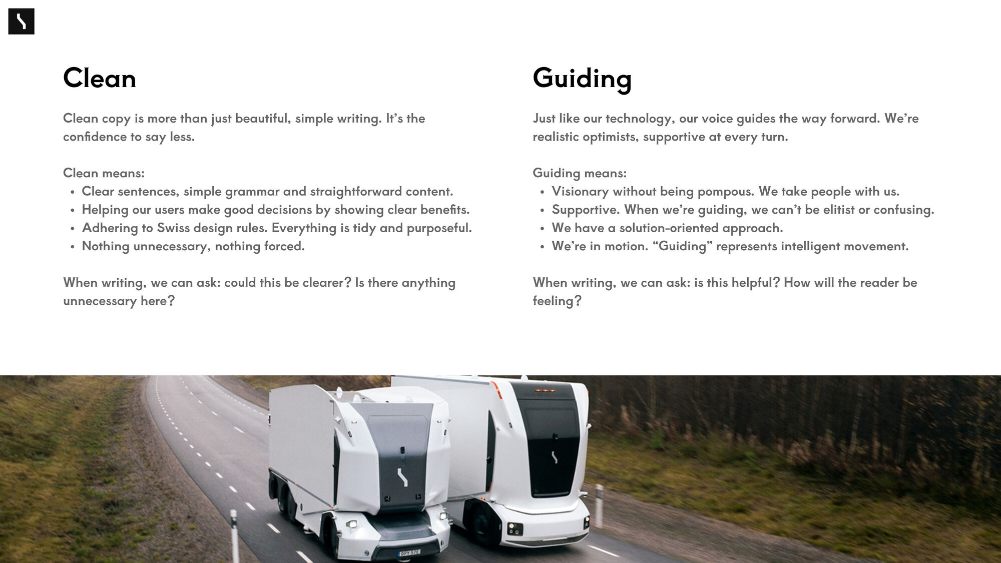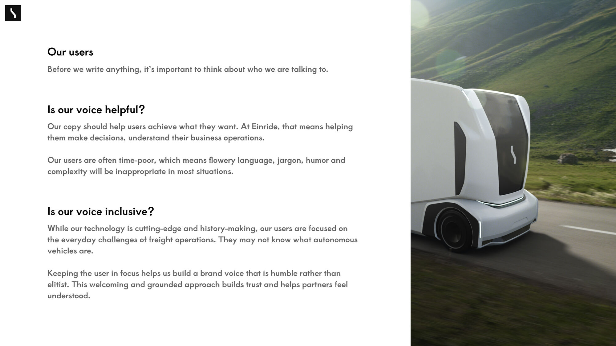 With multiple powerful apps and users from all over the world, the key to Einride’s voice was simplicity – but simplicity requires deep understanding. I collaborated closely with product and user research teams to gather as much information as we could about this emerging area of technology. Where terminology was unclear, or undeveloped, I helped create a logical approach for definition.